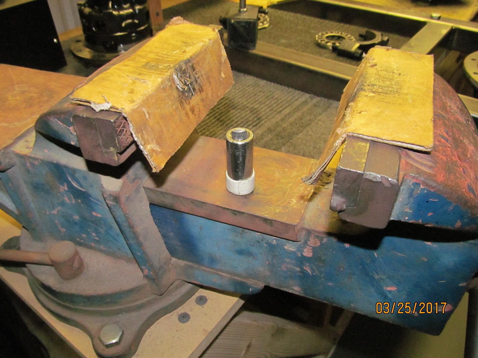 The case of the harrop need not get scratched so a couple pieces of cardboard and that just right socket will prevent the case from spinning in the vice. |