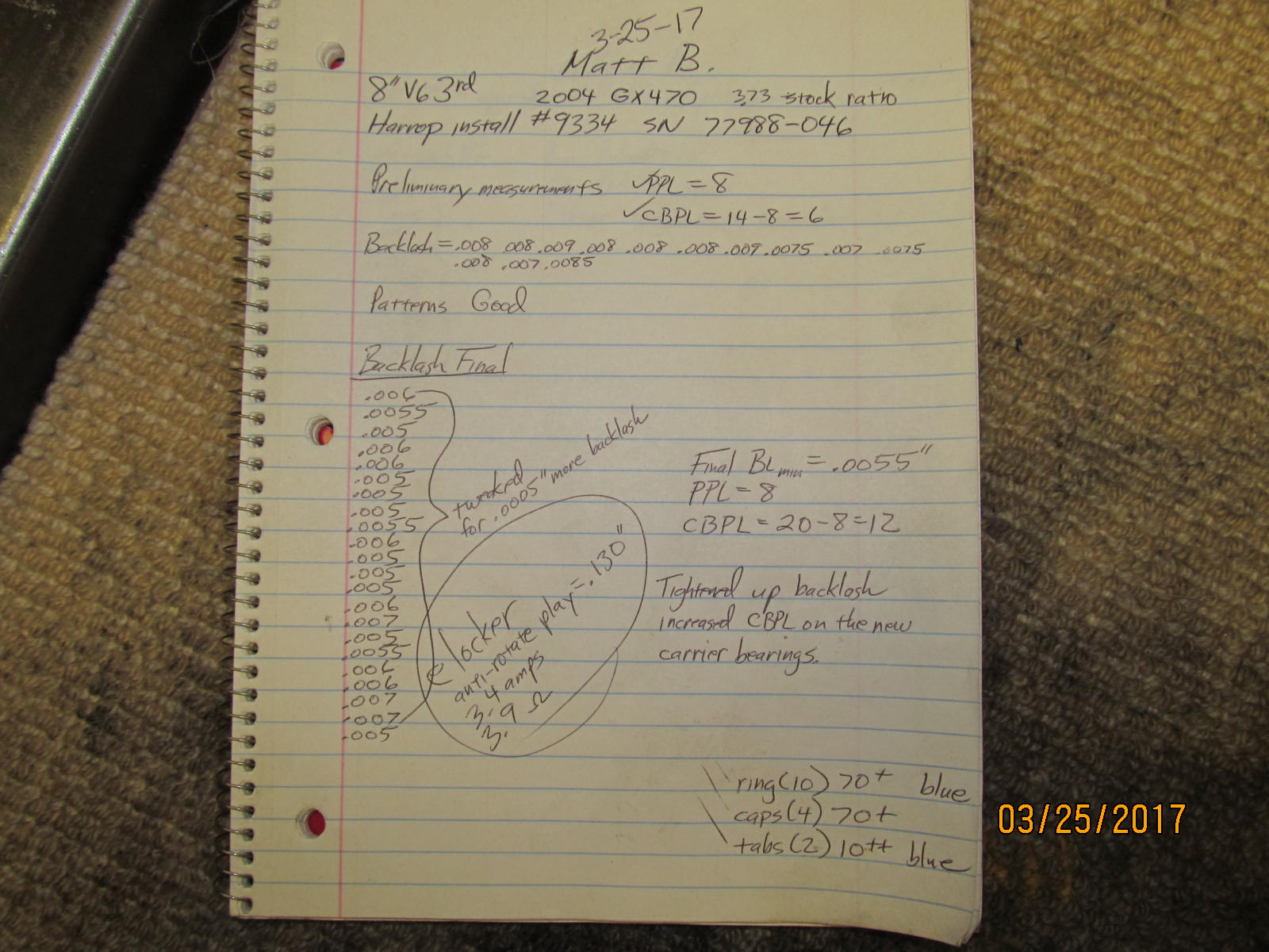 Matt just happened to have some business in the Phoenix area so he dropped off the 8" 3rd to me. Characterizing the parameters like backlash and bearing preloads and checking the general health of the diff is what is happening right now. |