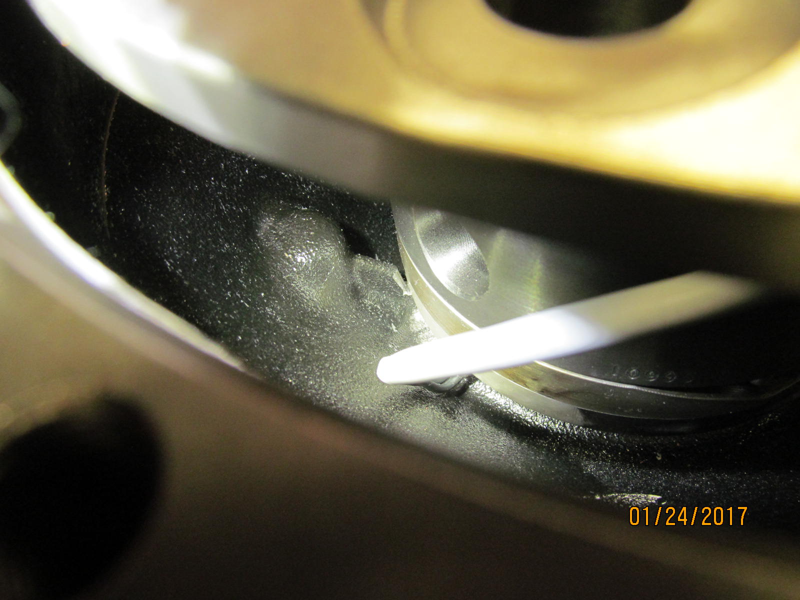 | Very close on the other side of the tabs, also. If the ring gear was mounted, I would not be able to get a visual on this. |