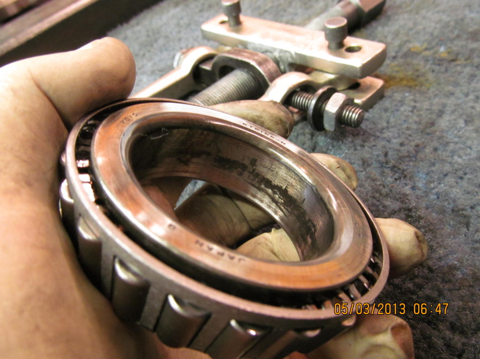 Here, I am using the salvaged old bearing pieces to assist in pressing on the new KOYO carrier bearings. |