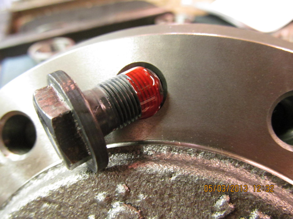 Red loctite is applied to the clean threads. One of the easiest ways to clean the threads is to use the 4000 rpm bench grinder with the wire wheel attached. Makes them look like brand new. |