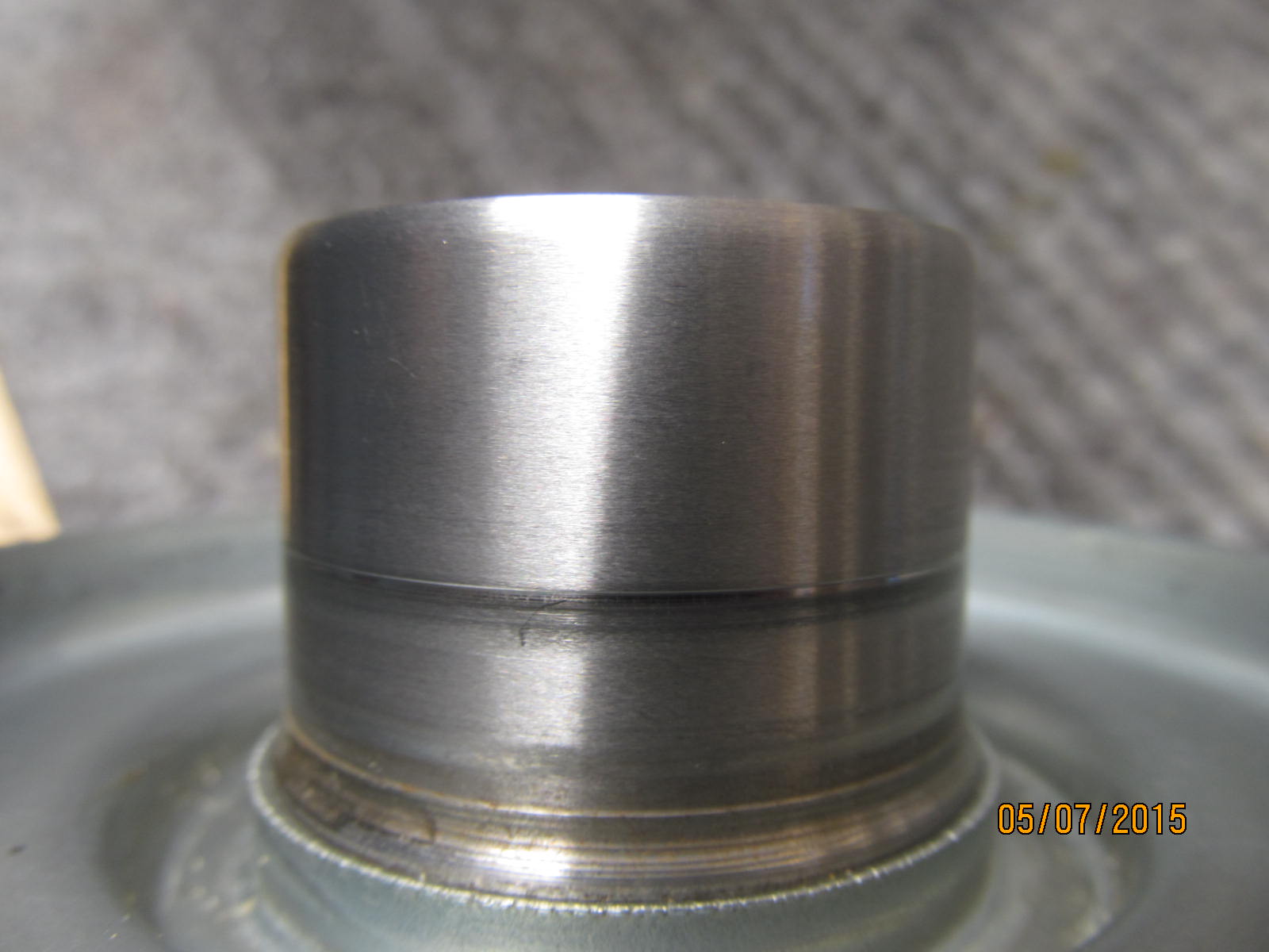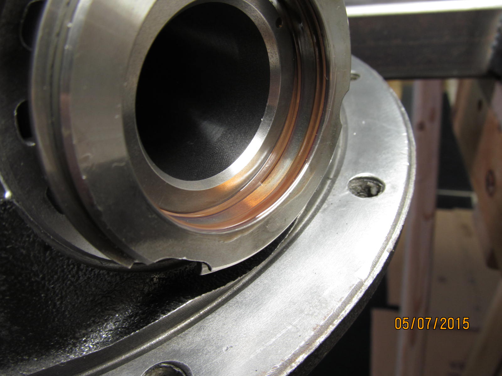 The old flange is cleaned up for inspection. The wear groove is small. Since the plan is to also install a new Marlin HD seal which has a big seal lip that rides in a much different spot, the issue of a groove goes away. In the above picture, I believe I remember the Marlin seal riding in a clean,virgin spot about .2" above the wear groove. |