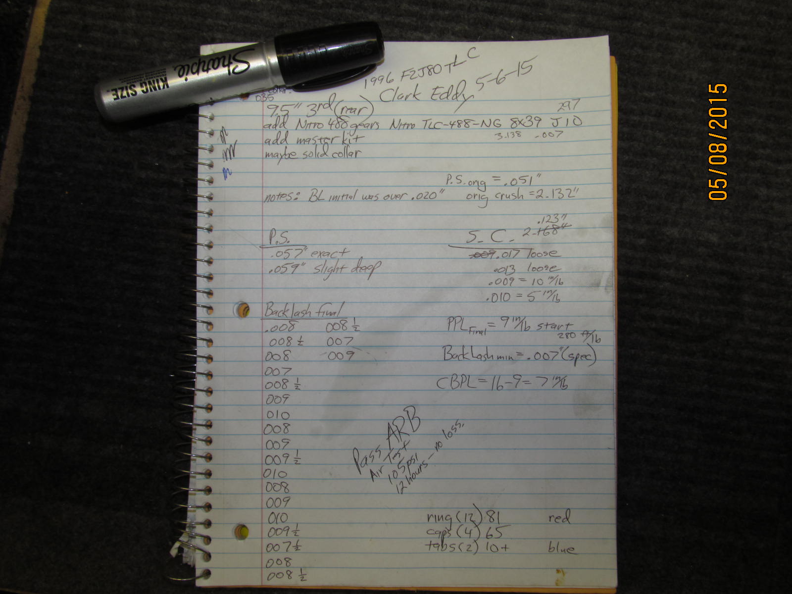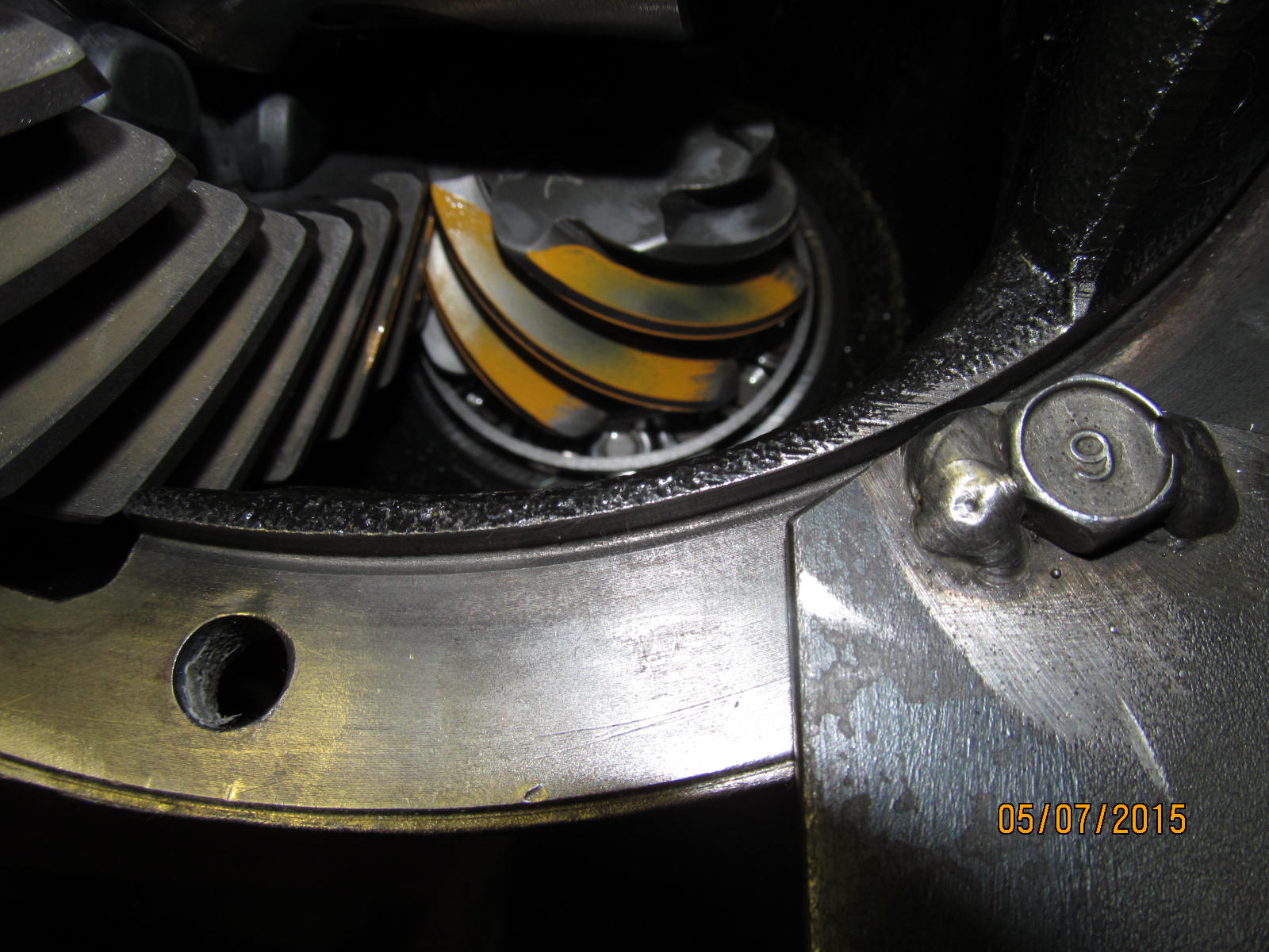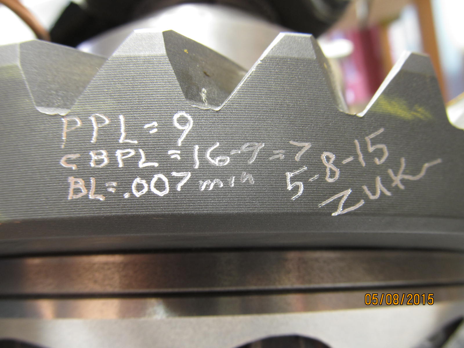 Backlash is recorded on every other tooth after the carrier bearing preload is set tight. I noted that the ring gear had .007" inscribed on it so that now becomes our minimum backlash allowed. |