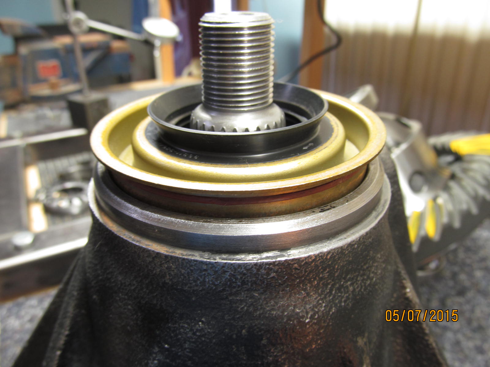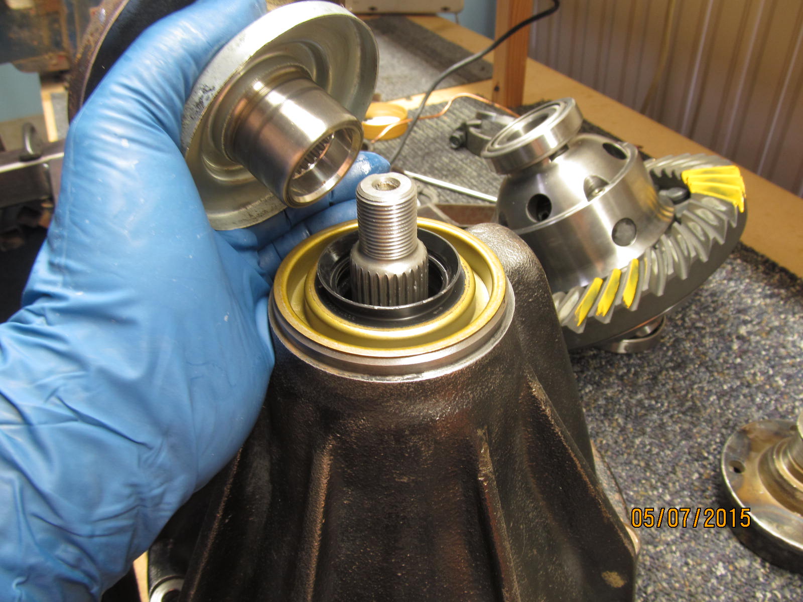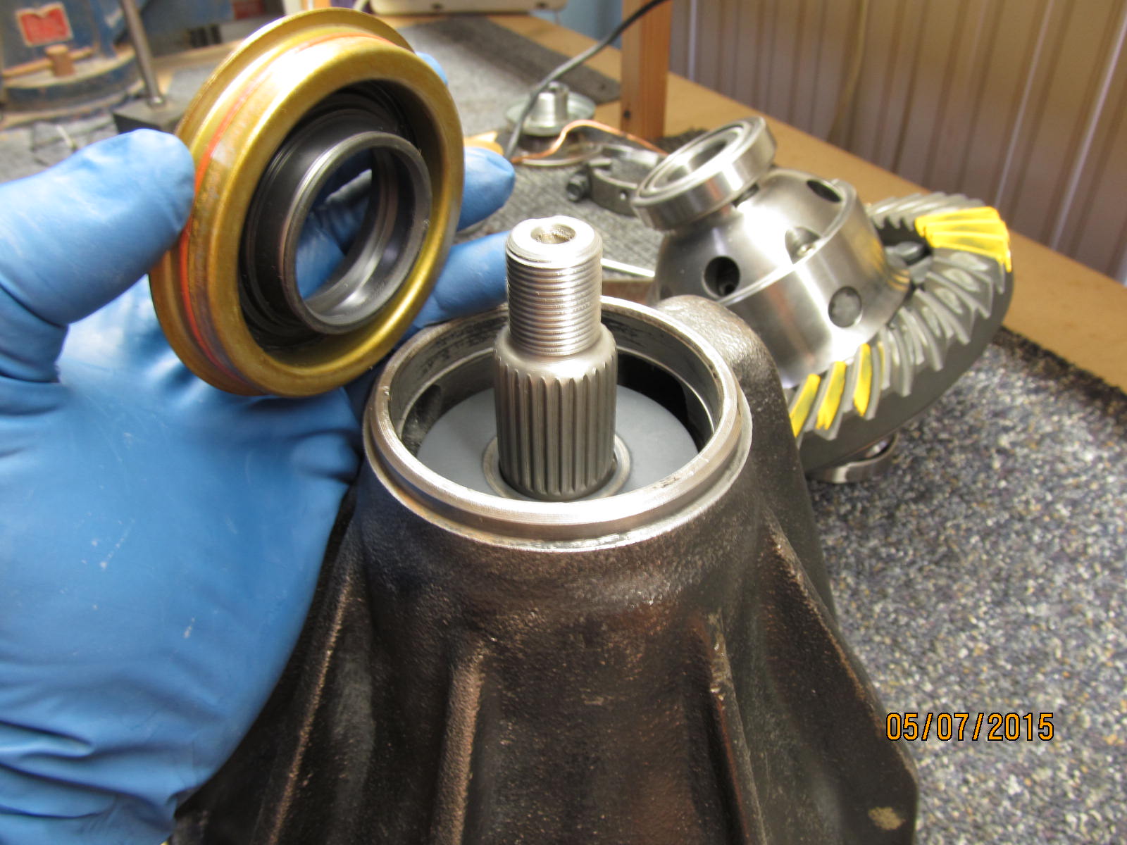 No pictures of the solid collar installation but there is one in there between the 2 bearings. As the assembly notes at the end of this link show, it took 4 times before getting it right. A Heavy duty Marlin Pinion seal will be used. These work with 27 count pinion splines only. |