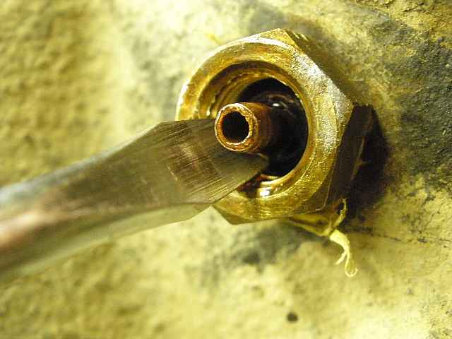 This happens to the end of the soft copper line when the brass bulkhead fitting is over-tightened and the fat o-ring starts to crush the copper. If this continues, it's possible to almost pinch off the line resulting in the air locker responding slower. |