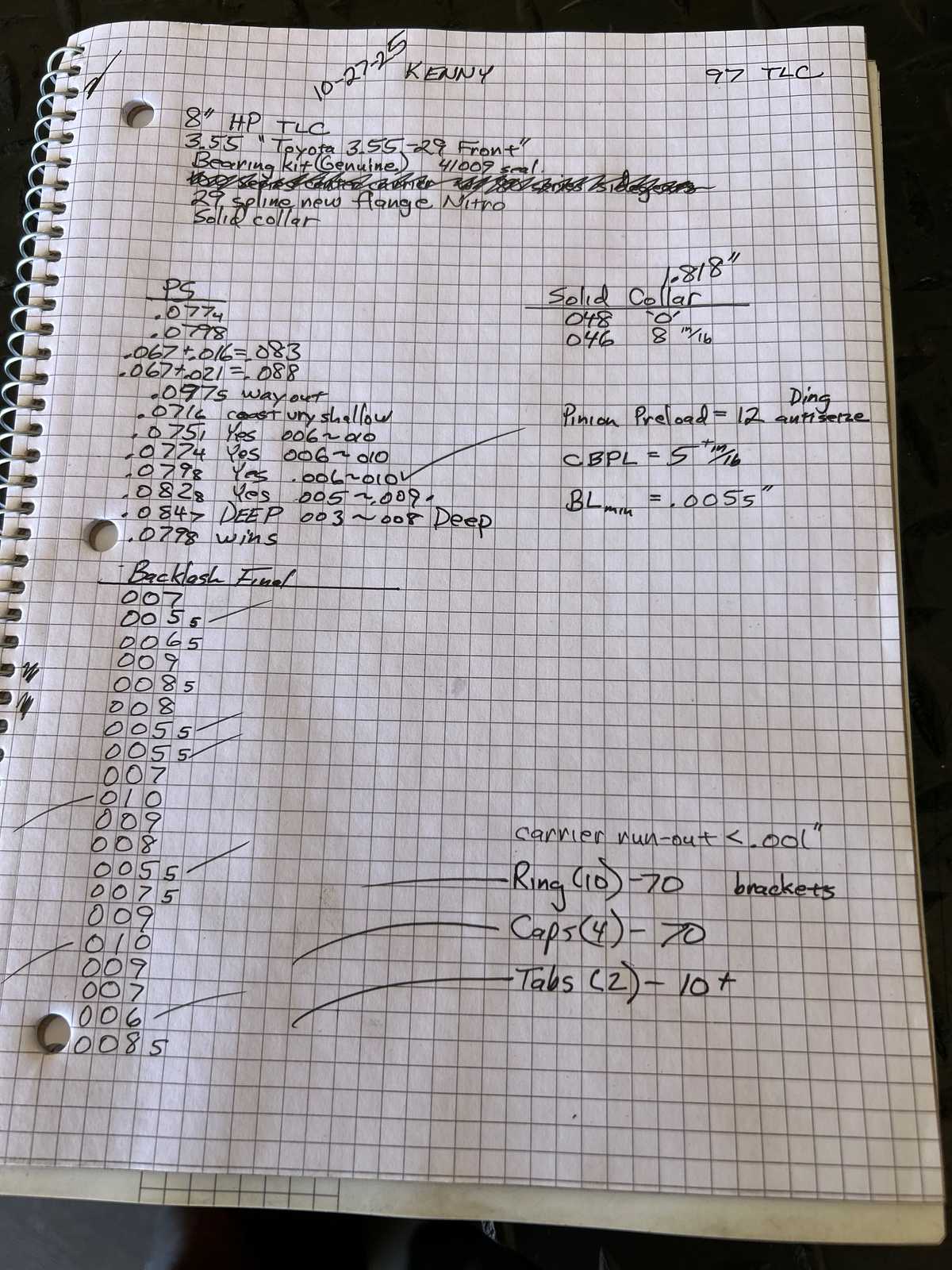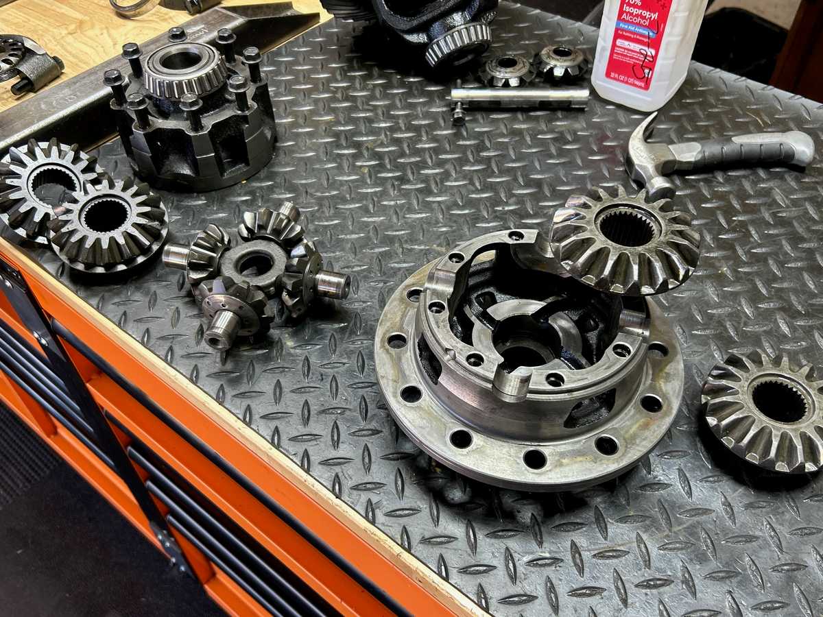 Backlash is measured between sidegear and the spiders. I noted about .060" and that needs to be closer to .002~.008" per factory specs. Adding a .040" shim to each sidegear solved that issue. |