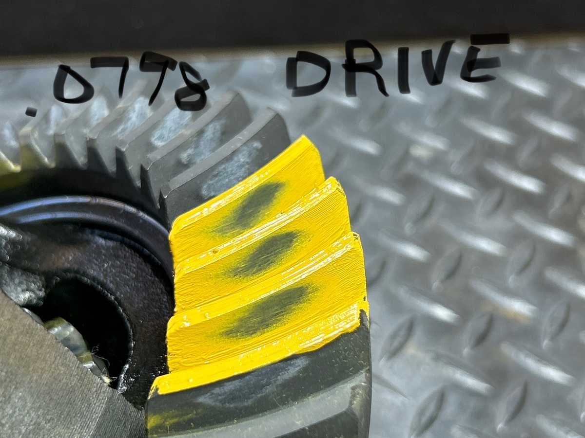 Now trying a thicker shim 058" drive...good looking but the backlash had to be .013" to prevent the pinion teeth from contacting the root of the ring gear and locking up the rotation. |