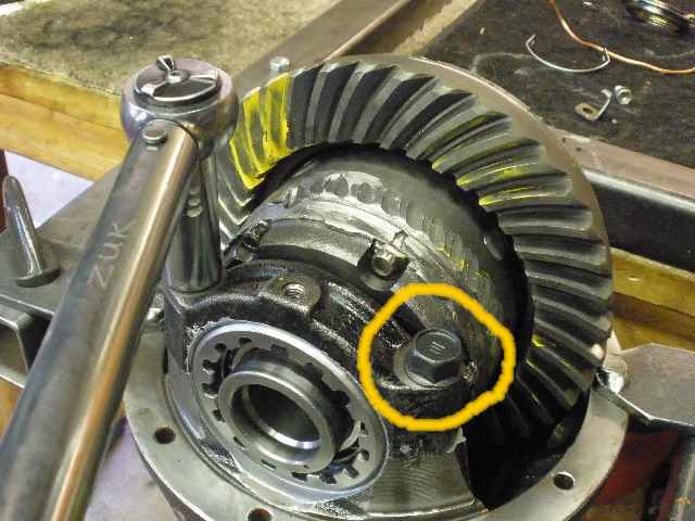 The bolt circled is the one with the damaged threads from the red Loctite. I used the torque wrench and it accepted 70 ft/lb with a good solid feel. |